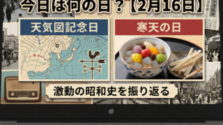 How To 今日は何の日?【2月16日】天気図記念日に寒天の日、激動の昭和史を振り返る 今日は何の日?【2月16日】天気図記念日に寒天の日、激動の昭和史を振り返る2026年2月16日の概要2026年2月16日(月曜日)、本日の六曜は「仏滅」です。一般的には祝い事を避ける日とされますが、「物が滅びて新たに始まる日」という解釈もあ... 2026.02.16 How Toお悩みトレンド元気・やる気が出るお話生活社会