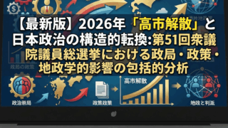 How To 【最新版】2026年「高市解散」と日本政治の構造的転換:第51回衆議院議員総選挙における政局・政策・地政学的影響の包括的分析 【最新版】2026年「高市解散」と日本政治の構造的転換:第51回衆議院議員総選挙における政局・政策・地政学的影響の包括的分析 日付: 2026年1月20日 主題: 第51回衆議院議員総選挙(2026年2月8日投開票)に向けた戦略的予測と政権... 2026.01.20 How Toお悩みトレンド生活社会