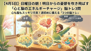 How To 【4月5日】日曜日の朝!明日からの憂鬱を吹き飛ばす「心と脳のエネルギーチャージ」脳トレ3問 おはようございます!2026年4月5日、日曜日の朝ですね。全国の社会人や学生の皆さん、新年度最初の週末、ゆっくり休めていますか?明日からは、いよいよ本格的な「新しい1週間」が始まります。日曜日の午後は「明日からまた早起きか…」「ちゃんとやっ... 2026.04.05 How Toお悩み元気・やる気が出るお話生活社会