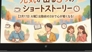 How To 【2月17日】出勤前の3分で心が軽くなる!火曜の朝に効く「元気が出る3つのショートストーリー」 【2月17日】出勤前の3分で心が軽くなる!火曜の朝に効く「元気が出る3つのショートストーリー」概要:心のチューニングを整える「物語の処方箋」「どうせ自分には無理だ」「完璧にやらなきゃと思うと手が動かない」「職場の雰囲気がギスギスしていて居心... 2026.02.17 How Toお悩み元気・やる気が出るお話生活社会