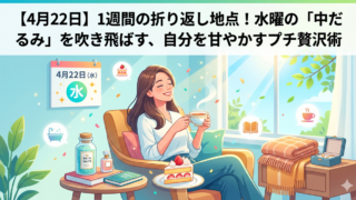 How To 【4月22日】1週間の折り返し地点!水曜の「中だるみ」を吹き飛ばす、自分を甘やかすプチ贅沢術 おはようございます!2026年4月22日、水曜日の朝がやってきました。全国の社会人や学生の皆さん、まずは大きく深呼吸をして、自分自身に拍手を送ってあげてください。新年度4週目というただでさえ疲労が溜まる時期に、月曜・火曜と無事に生き抜き、つ... 2026.04.22 How Toお悩み元気・やる気が出るお話生活社会