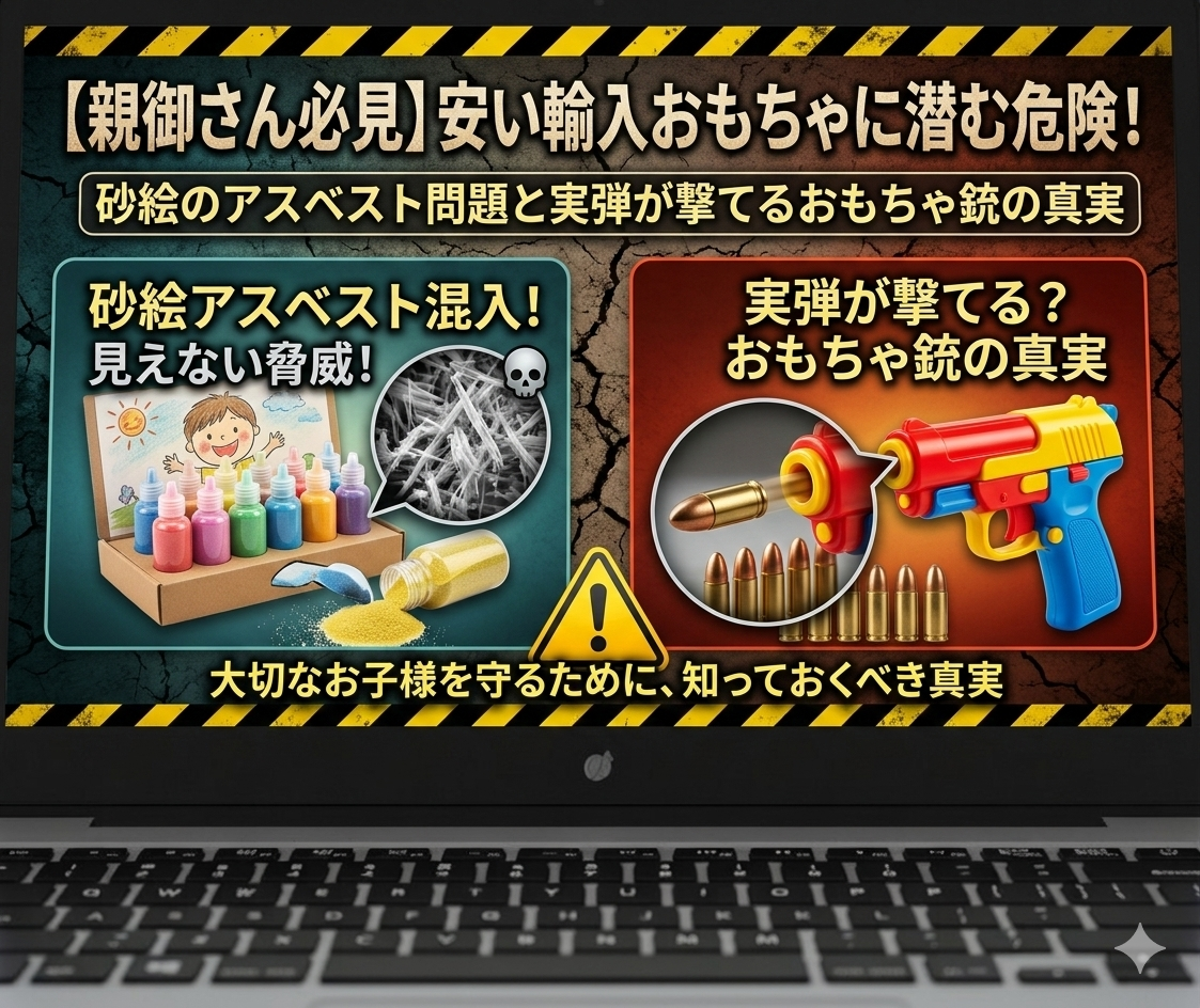 結論からお伝えします。現在、日本の市場には、中国などを中心とした海外で安く作られたおもちゃが大量に流入しています。そして残念なことに、その中には発がん性物質である「アスベスト(石綿)」が含まれた砂絵セットや、なんと本物の弾が撃ててしまうおもちゃの銃が混ざり込んでおり、実際に大きな社会問題になっています。
