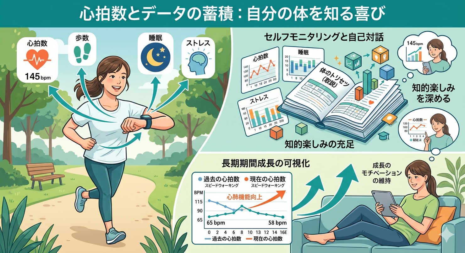 また、長期的なデータの推移を見ることで、数ヶ月前よりも同じスピードで歩いても心拍数が上がりにくくなっている(=心肺機能が向上している)ことに気づくかもしれません。この「目に見える成長」は、何物にも代えがたいモチベーションの維持装置となります。数値化された体の変化は嘘をつきません。その正確さが、私たちの継続する意志を力強く支えてくれるのです。