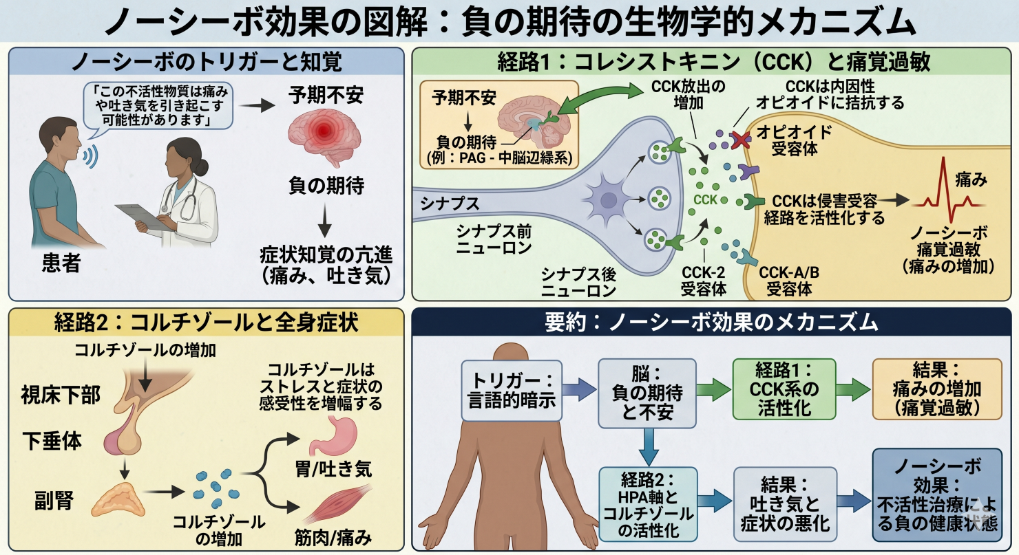 具体的には、薬の説明書を読んで副作用の項目を過剰に気にしすぎたり、医師から「この処置は少し痛みますよ」と言われたりすることで、通常よりも強く痛みを感じたり、吐き気や頭痛を引き起こしたりすることがあります。これは、不安を感じることで脳内物質のバランスが崩れ、痛みに対して過敏になってしまうために起こります。