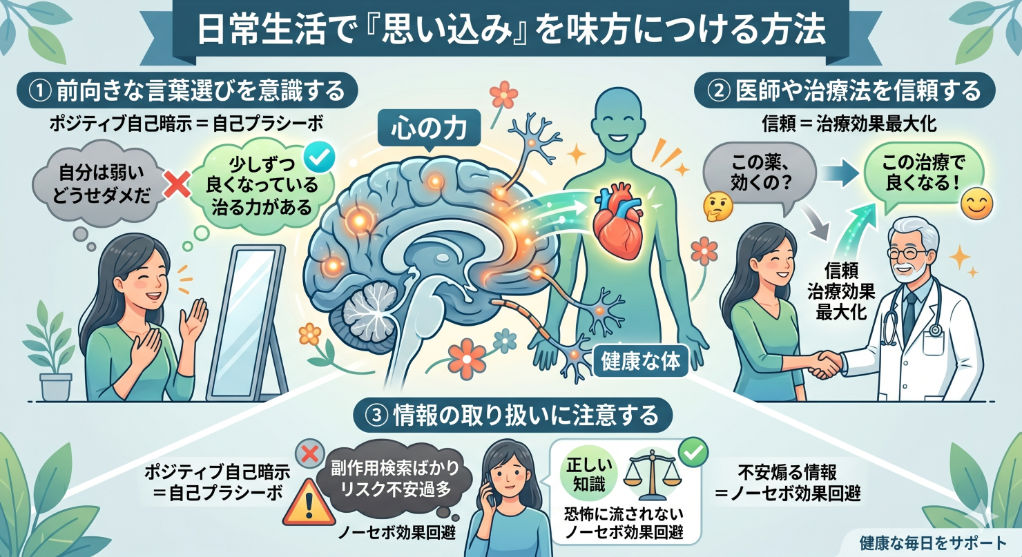 病院にかかる際、医師に対して疑心暗鬼になったり、治療法を信じられなかったりすると、せっかくの薬も効果が半減してしまう可能性があります。納得いくまで対話し、信頼できるパートナーとして医師と向き合うことで、治療効果を最大限に引き出すことができます。「この治療を受ければ良くなる」という信頼感こそが、最も身近で強力な特効薬なのです。