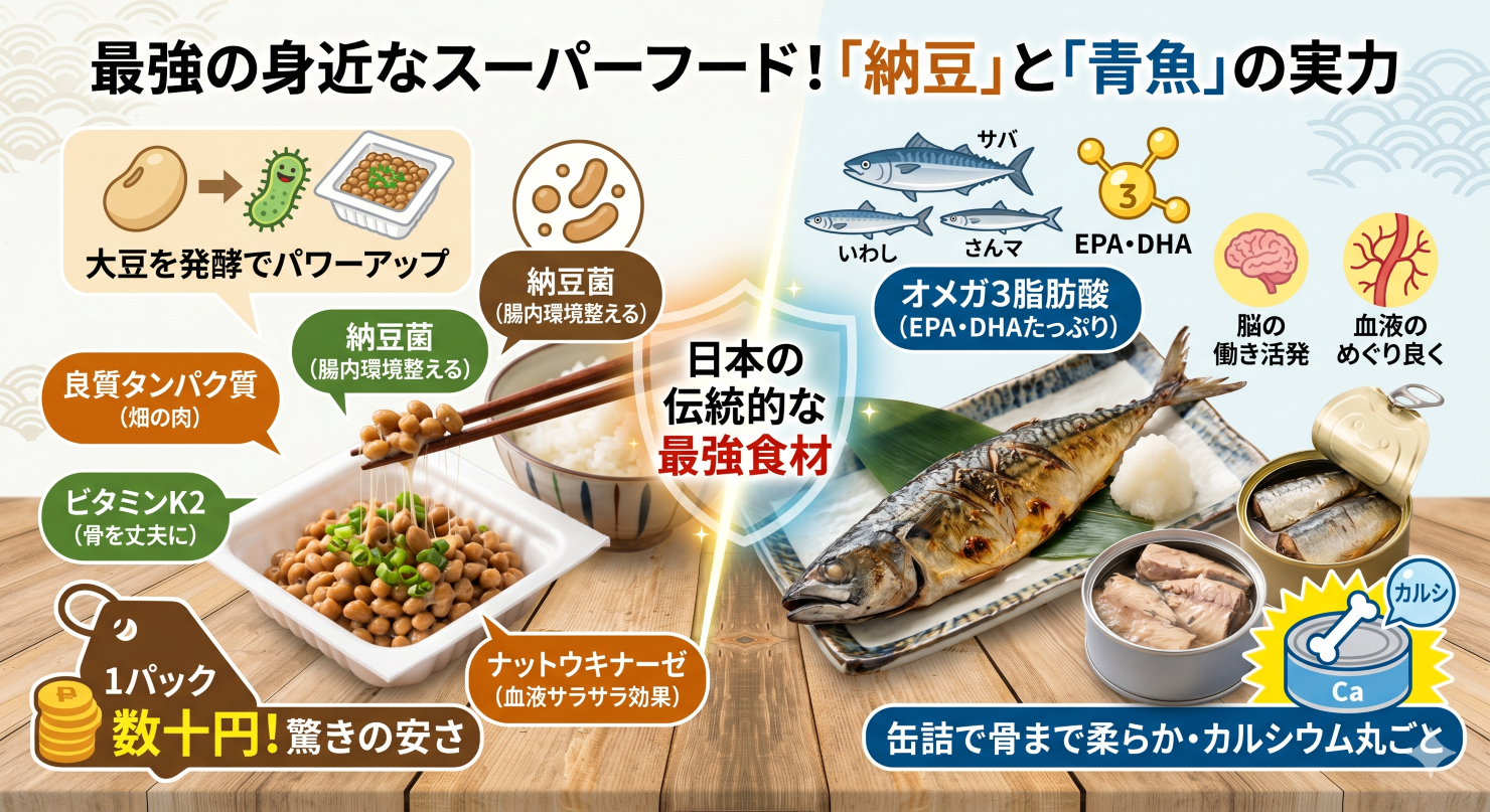 海外からやってきたおしゃれな食材が注目される一方で、日本には古くから食べられてきた「最強の身近なスーパーフード」が存在することをご存知でしょうか。その代表格と言えるのが、日本の食卓に欠かせない「納豆」と「青魚」です。