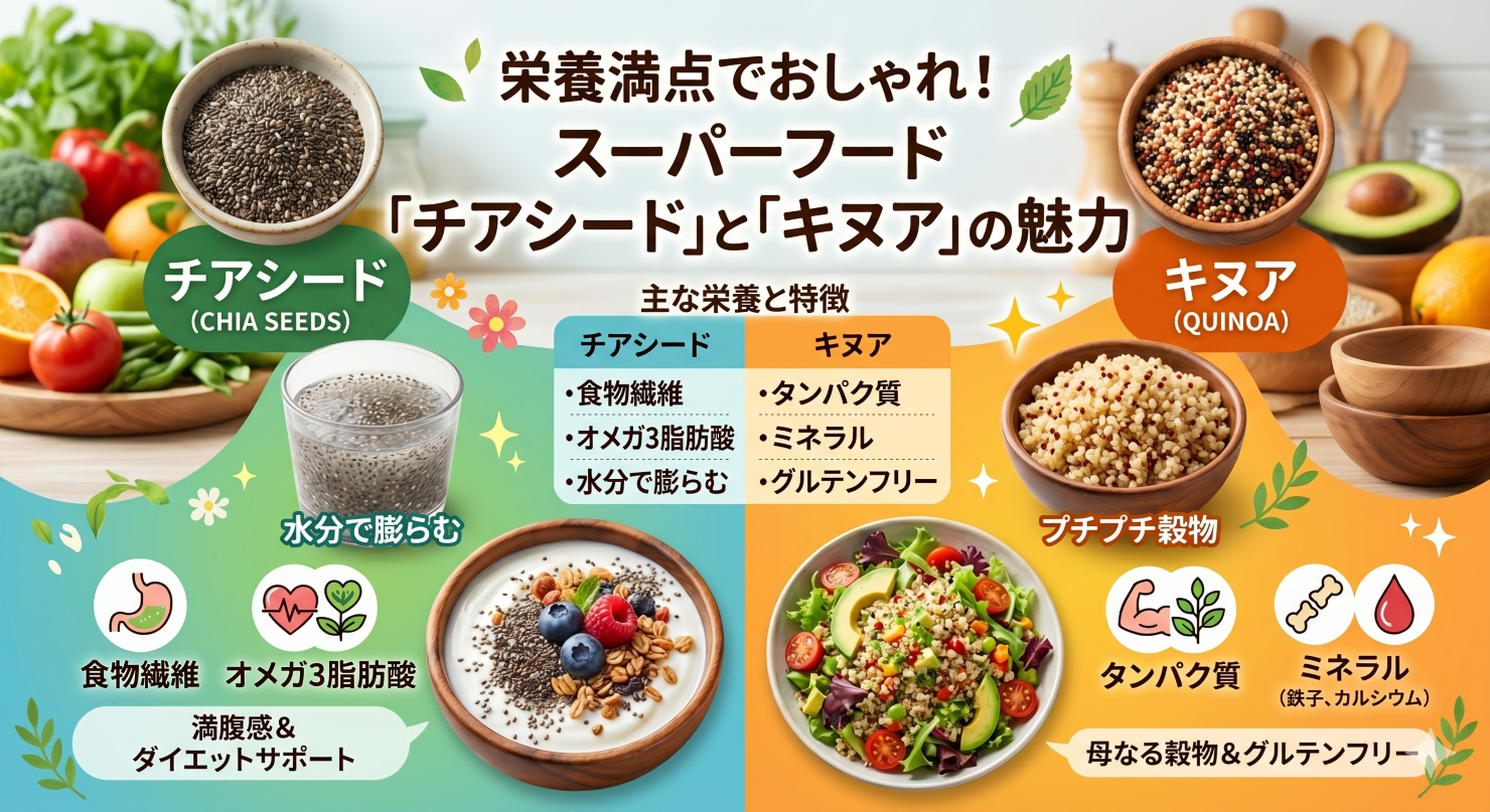 ここで、スーパーフードの代表格としてよく名前が挙がる「チアシード」と「キヌア」の栄養価について、詳しく見ていきましょう。これらがなぜ世界中でこれほどまでに注目されているのか、その理由を知ることはとても大切です。