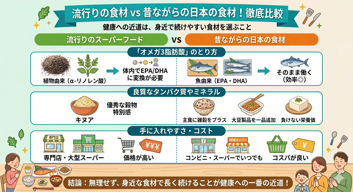 そして何より、最も大きな違いは「手に入りやすさ」と「価格(コストパフォーマンス)」です。チアシードやキヌアは、専門店や輸入食品を扱う大きなスーパーに行かないと手に入らないことが多く、価格も決して安くはありません。一方で、納豆や青魚(缶詰も含む)は、近所のコンビニや小さなスーパーで、一年中いつでも安く手に入れることができます。健康的な食生活は「長く毎日続けること」が何よりも重要です。特別な食材を無理して買うよりも、身近で続けやすい食材を選ぶ方が、結果的に健康への一番の近道となるのです。