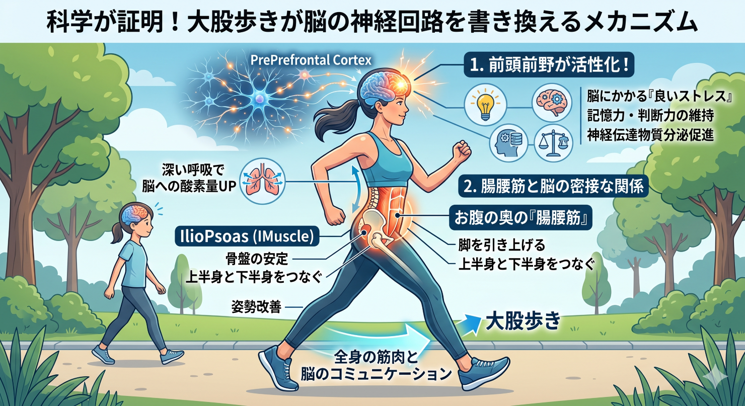 歩幅を広げるために最も重要な筋肉が、お腹の奥にある「腸腰筋(ちょうようきん)」です。この筋肉は脚を高く引き上げる役割を持っており、上半身と下半身をつなぐ唯一の筋肉でもあります。腸腰筋がしっかり使われると、骨盤が正しい位置に安定し、姿勢がシャキッと伸びます。姿勢が良くなると、肺が広がって深い呼吸ができるようになり、脳へ送り込まれる酸素の量も増えます。つまり、大股で歩くことは「筋肉を鍛える」と同時に「脳のエネルギー効率を最大化する」ことにも繋がっているのです。