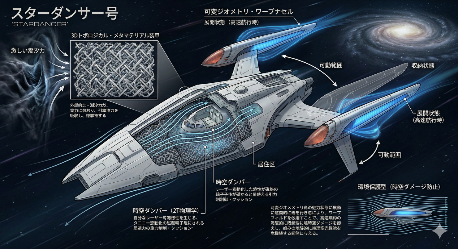 船の装甲には、「3Dトポロジカル・メタマテリアル」という特殊な構造の素材が使われます。これは、入ってきた衝撃波や重力の歪みを、スポンジのように吸収して受け流すことができるハイテク素材です。