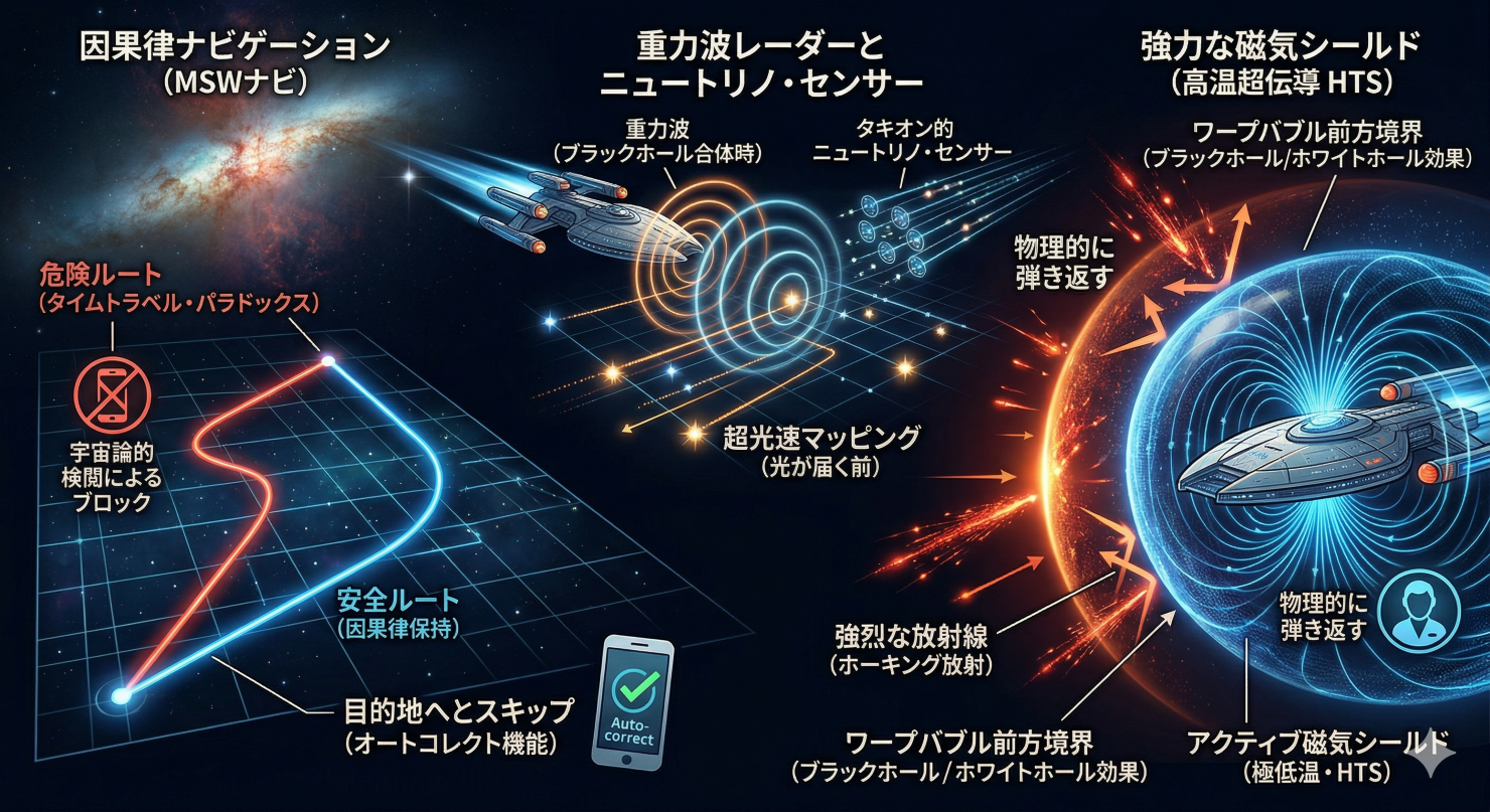 ワープバブルの前方には、見かけ上の「ブラックホールとホワイトホール」のような境界ができ、そこから強烈な放射線(ホーキング放射)が降り注ぎます。これらを防ぐため、極低温環境を利用した高温超伝導(HTS)によるアクティブ磁気シールドを展開します。船を覆う強力な磁力のバリアが、高エネルギーの放射線やプラズマを物理的に弾き返し、乗組員の命を確実に守り抜きます。