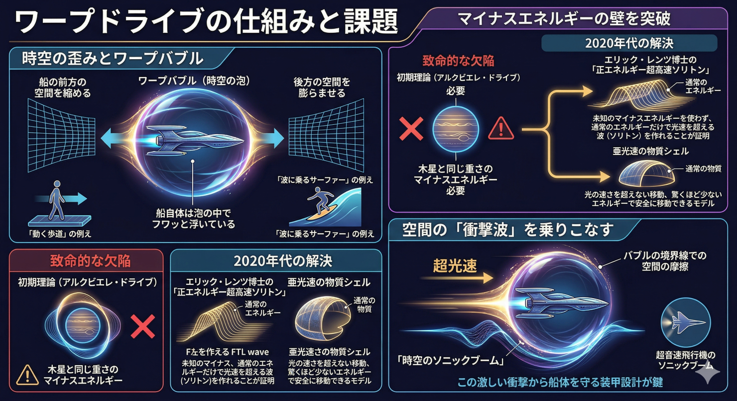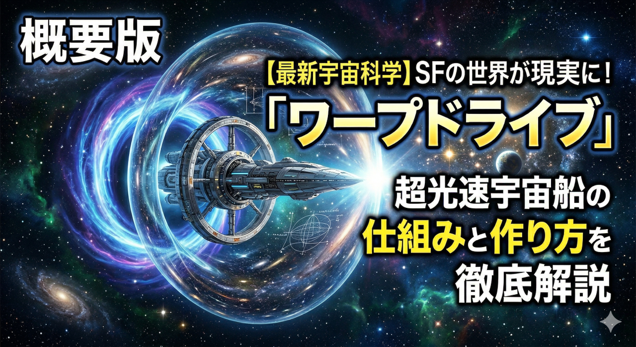 本記事では、難解な最新論文や専門用語を読み解きながら、「どうすれば光の速さを超えられるのか?」「どんなエンジンや素材が必要なのか?」を、科学に詳しくない方にもわかりやすく、例え話を交えて解説します。結論から言えば、途方もないマイナスエネルギー(魔法の物質)を必要としたかつての理論は過去のものとなり、現在では「私たちが知る物理法則の範囲内」でワープ宇宙船を建造する道筋が見えてきているのです。