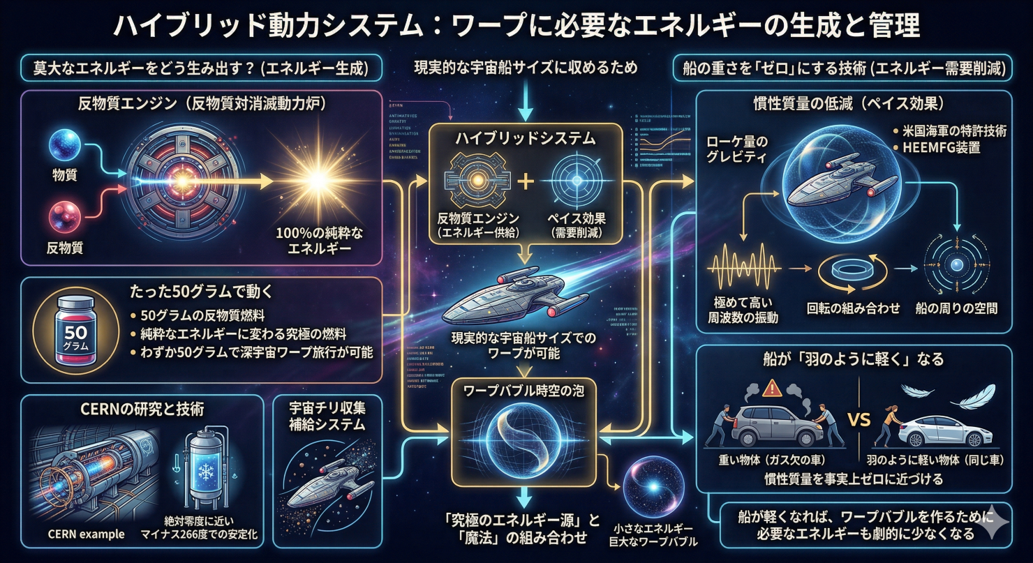 通常のエネルギーでワープが可能になったとはいえ、それでも想像を絶するパワーが必要です。これを現実的な宇宙船サイズに収めるため、本作戦では「究極のエネルギー源」と「船を極限まで軽くする魔法」を組み合わせます。