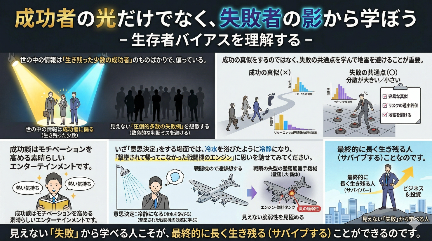 - 見えない「圧倒的多数の失敗例」を想像しないと、致命的な判断ミスを犯す。