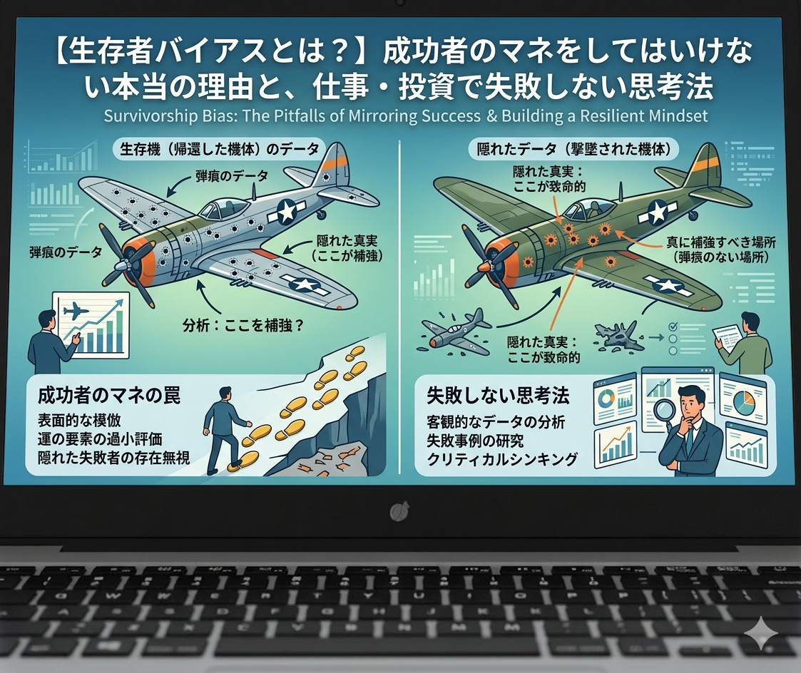 「生存者バイアス」とは、「たまたま生き残った(成功した)人やデータだけを見て、背後にいる圧倒的多数の『失敗して消えていった人やデータ』を見落としてしまう」という心理的な思い込みのことです。