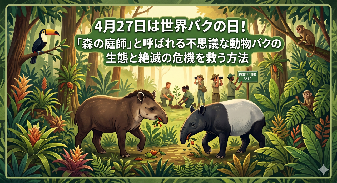 動物園で、白と黒のツートンカラーが印象的な「バク」を眺めたことはありますか?ゾウのような鼻に、カバのような体、そしてサイのような足。複数の動物を継ぎ合わせたようなその不思議な姿は、一度見ると忘れられない魅力があります。実は、毎年4月27日は、この愛すべきバクたちを主役にした「世界バクの日(World Tapir Day)」です。なぜ特定の動物のために世界的な記念日が設けられたのか、そして彼らが私たちの住む地球にとってどれほど重要な存在なのか、あなたはご存知でしょうか。